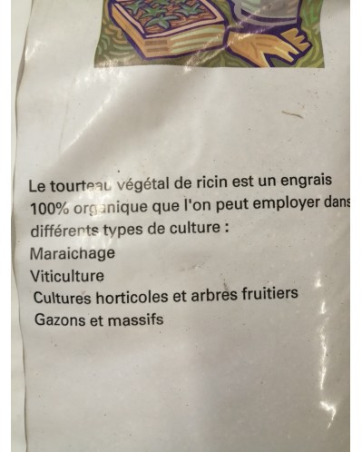 Le tourteau de ricin est un engrais organique 100 % végétal , à fort potentiel humique et riche en oligo-éléments , il est utilisé comme engrais azoté pour les cultures potagères , il est obligatoire de l'enfouir aprés épandage .