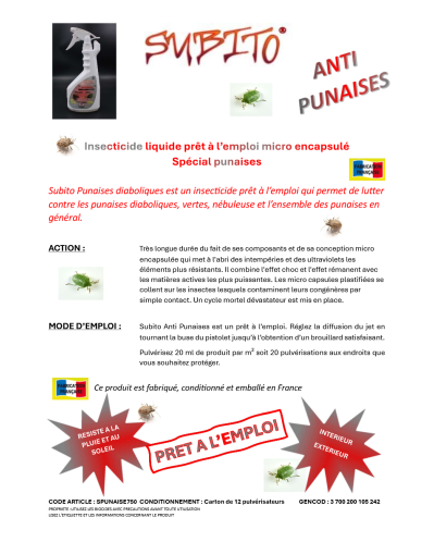 Insecticide prêt à l'emploi qui permet de lutter contre les punaises diaboliques, vertes, punaises nébuleuses et l'ensemble des punaises en général.Ce produit possède une formule microencapsulée qui permet d'emprisonner dans une pellicule plastifiée les éléments actifs du produit.Il résiste au soleil et à la pluie pour une action plus durable dans le temps.Agit de deux façons, une première action foudroyante et une deuxième rémanente durant quelques jours.Peut s'utiliser à l'intérieur des maisons ou des bâtiments mais aussi à l'extérieur autour des portes et fenêtres , sur les façades et les murs des bâtiments.